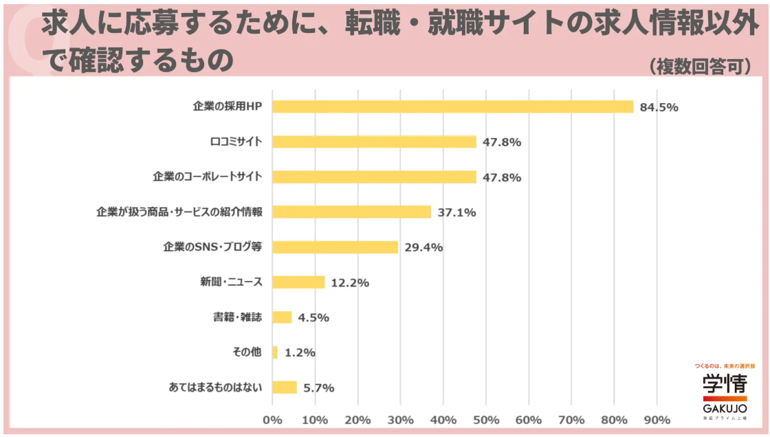 株式会社学情のアンケート調査によると、求職者の84.5%は求人応募のために「企業の採用HP」を閲覧しています。採用HPの他にも、コーポレートサイト、SNS・ブログなどを閲覧してから応募する求職者も一定数います。